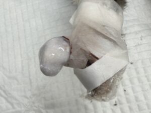 ↓が軟膏処置後です。表面が乾燥して出血がとまり腫瘤自体はありますが、かなり生活しやくなりました、1週間毎くらいで処置は必要ですが、その1週間の間に表面が脱落し2,3周り縮小することもあります。 この子も1週間で2/3程度に縮小しました。