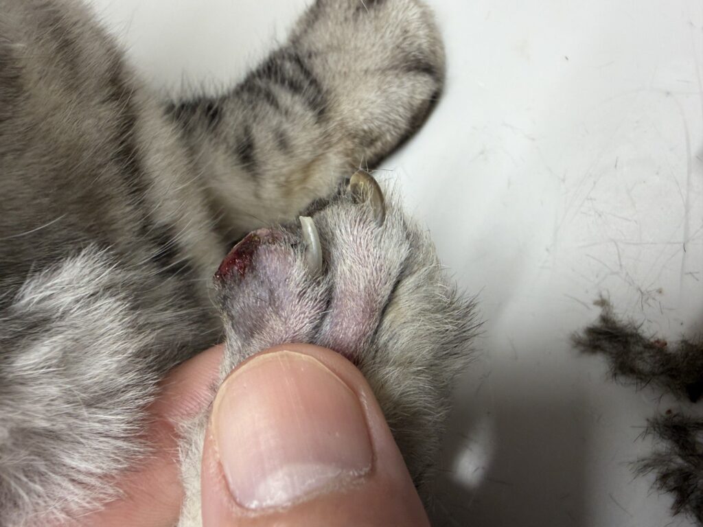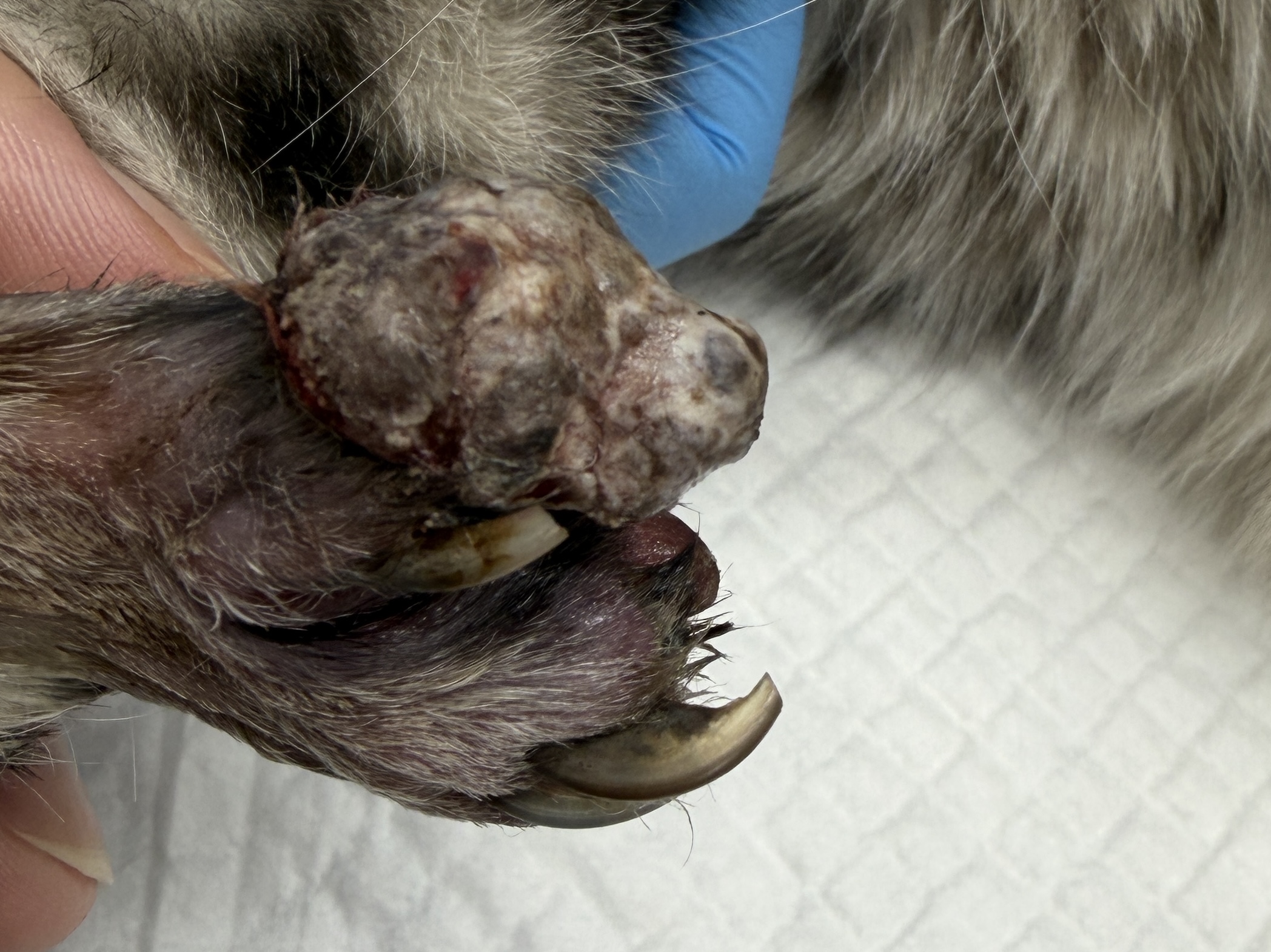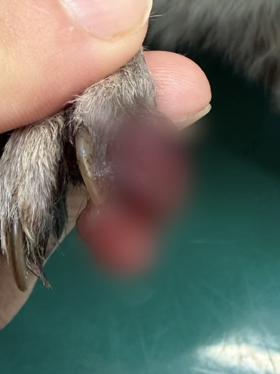 指(肉球)に腫瘤が確認され増大傾向があった。高齢で心臓や腎臓の疾患があり麻酔リスクがあったが、将来的なことを考え一度切除(断指術)の手術を行おうとしたが、麻酔導入直後に不整脈が出たため中止。手術の実施は困難なので、消毒や包帯で管理していたが、じわじわと出血が続くのと、消毒などの管理が大変だったのと腫瘤の増大傾向が強かったのでモーズ軟膏処置を提案しました。